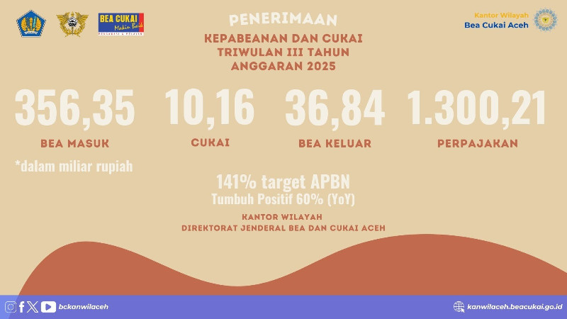 DIALEKSIS.COM | Banda Aceh - Kinerja penerimaan negara dari sektor kepabeanan dan cukai di wilayah Aceh terus menunjukkan tren positif hingga Triwulan III Tahun 2025.